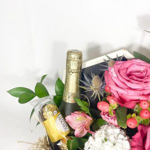 Arranjo com rosa pink e flores nobres + Cachepô de madeira decorativo + Ferreiro Rocher 6 un. + Espumante